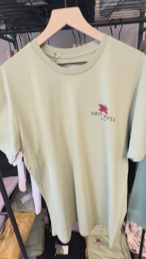 Our hand-drawn illustration puts the explorer where he belongs: riding a wave, not searching for miracles. 3-color water-based screenprint on soft pistachio cotton. The kind of tee that starts conversations.