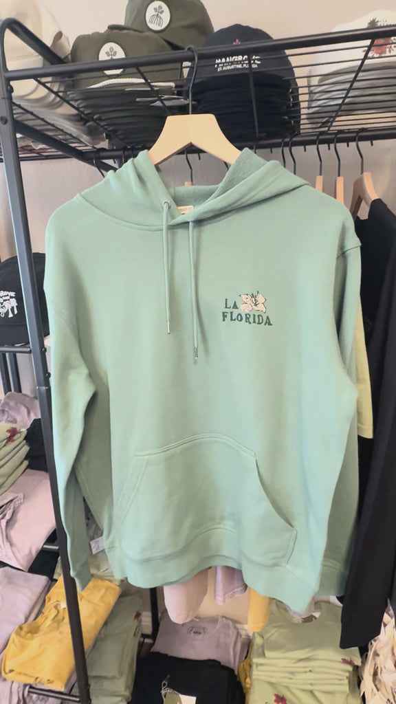 The hoodie for coastal mornings. Heavy enough for dawn patrol, light enough for all day. Hand-drawn La Florida map honoring the heritage of historic Florida, on 10oz French terry in faded sage.